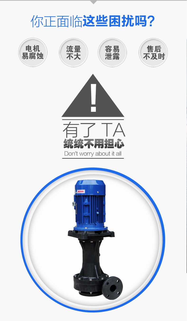 3.要选择平坦且不会被其它机器引起振动的地点作为安装位置,并且为日后保养维修时留有足够的空间。4.固定泵的基础面积必须大于泵的底座面积。如果固定面积不够大,会因受力集中使底座损坏。5.如果耐酸碱液下泵工作时受到振动,则需在泵与管路之间安装膨胀节抵消振动,否则泵浦、管理、压力表等会损坏。